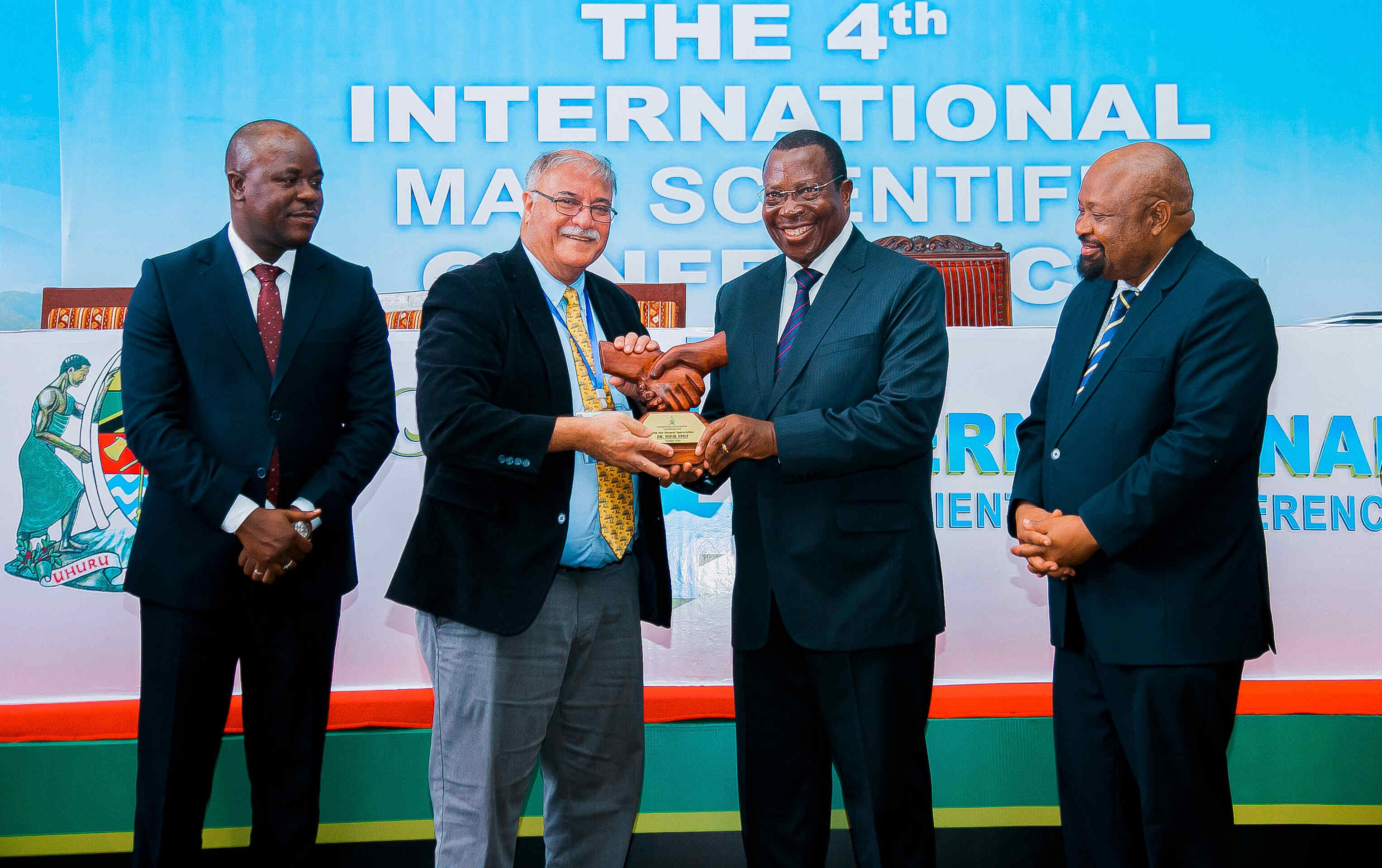 The keynote Speaker Dr. Rafiki Hirji (Second left), Receiving an Award During the 4th International Maji Scientific Conference